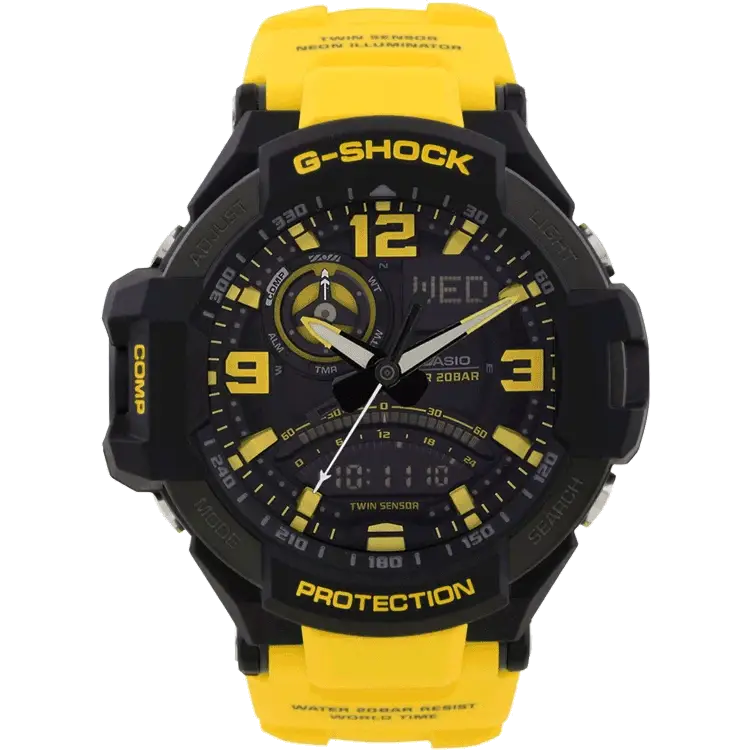 - Energy: Alarm (S) Auto Calendar Chronograph/Stopwatch Compass Countdown Timer Light Function Moon Data / Tide Graph Shock Resistant Thermometer Vibration Resistant World Time