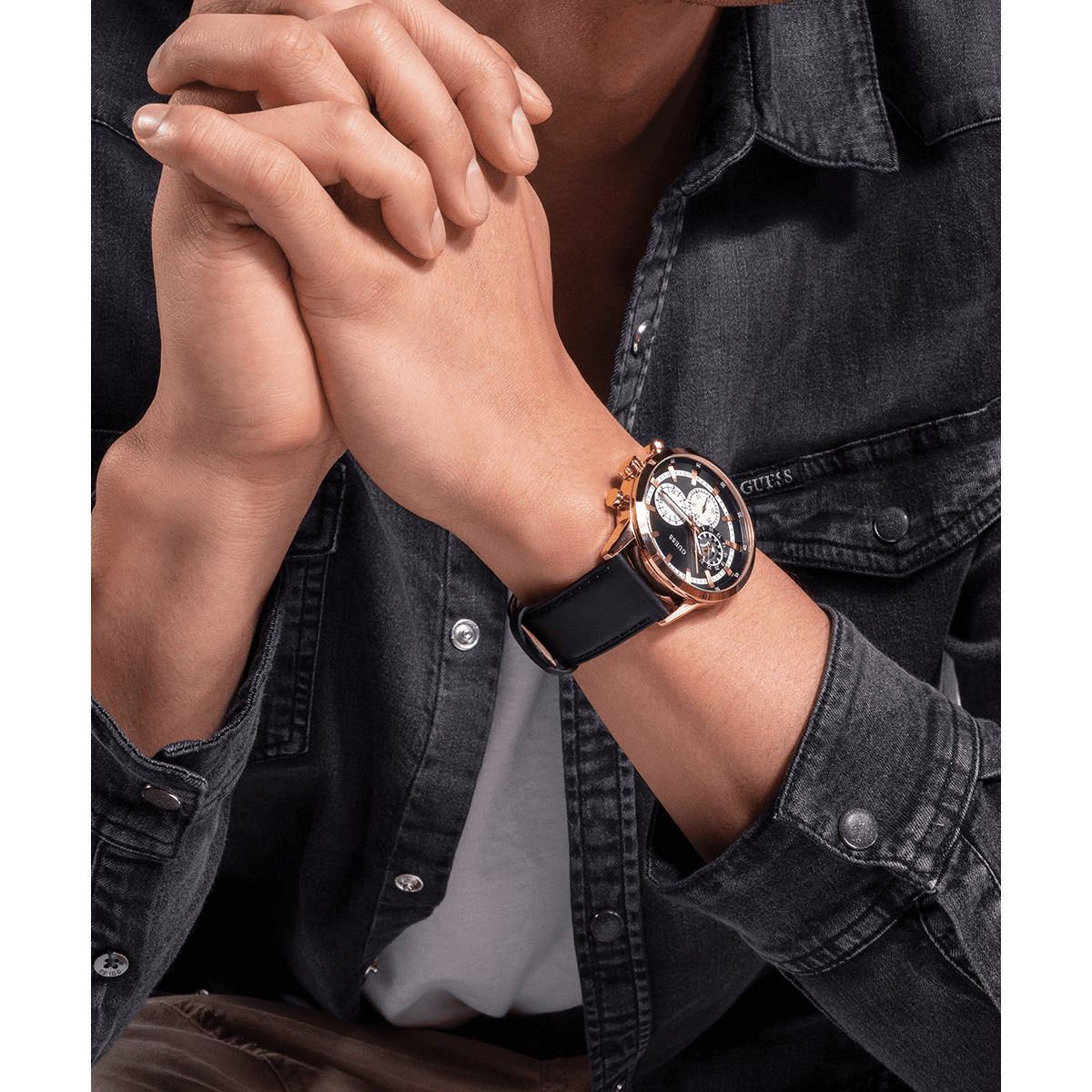 GUESS Mens Black Gold Tone Multi-Function Watch