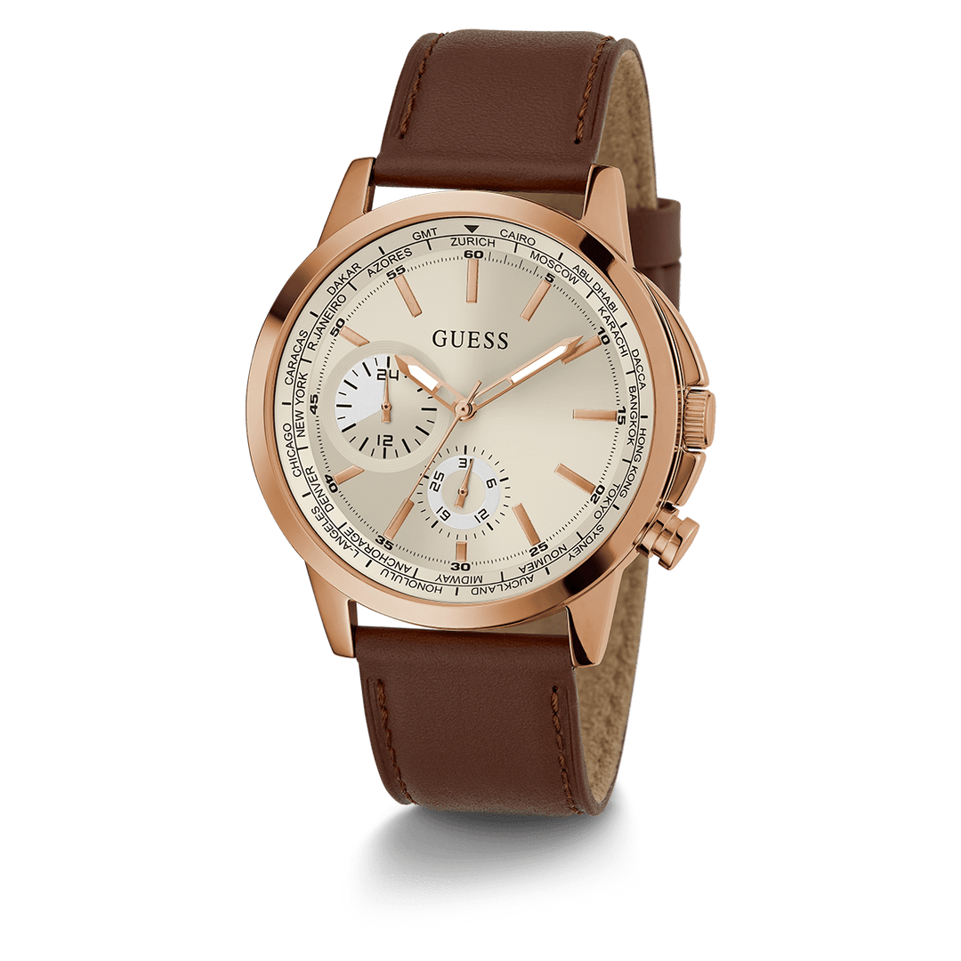 GUESS Mens Brown Rose Gold Tone Multi-Function Watch