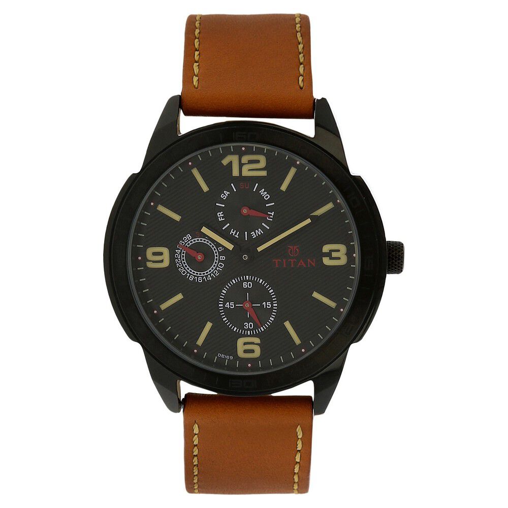 Titan Quartz Multifunction Black Dial Leather Strap Watch for Men NS1585NL01