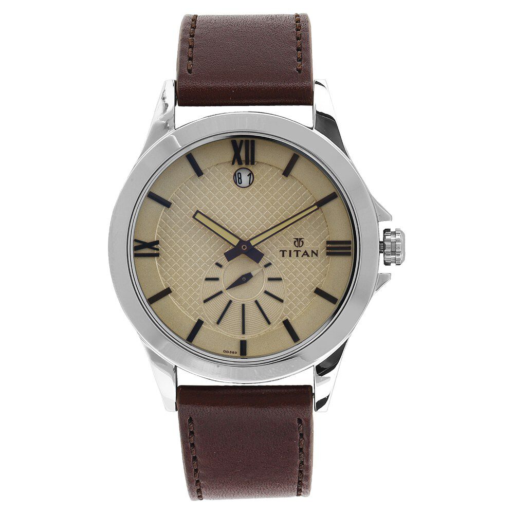 Titan Smart steel Beige Dial Analog with Date Leather Strap watch for Men-9323SL01