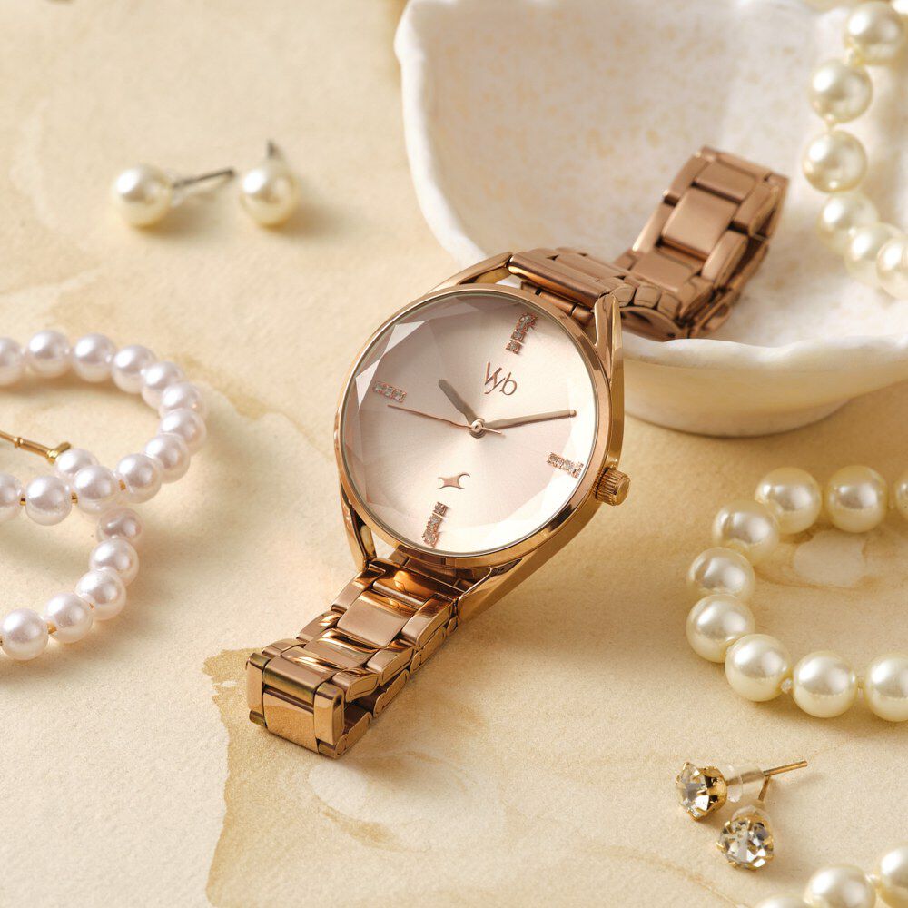 Fastrack Vyb Aurora Quartz Analog Rose Gold Dial Rose Gold Color Metal Strap Watch For Girls FV60052WM02W