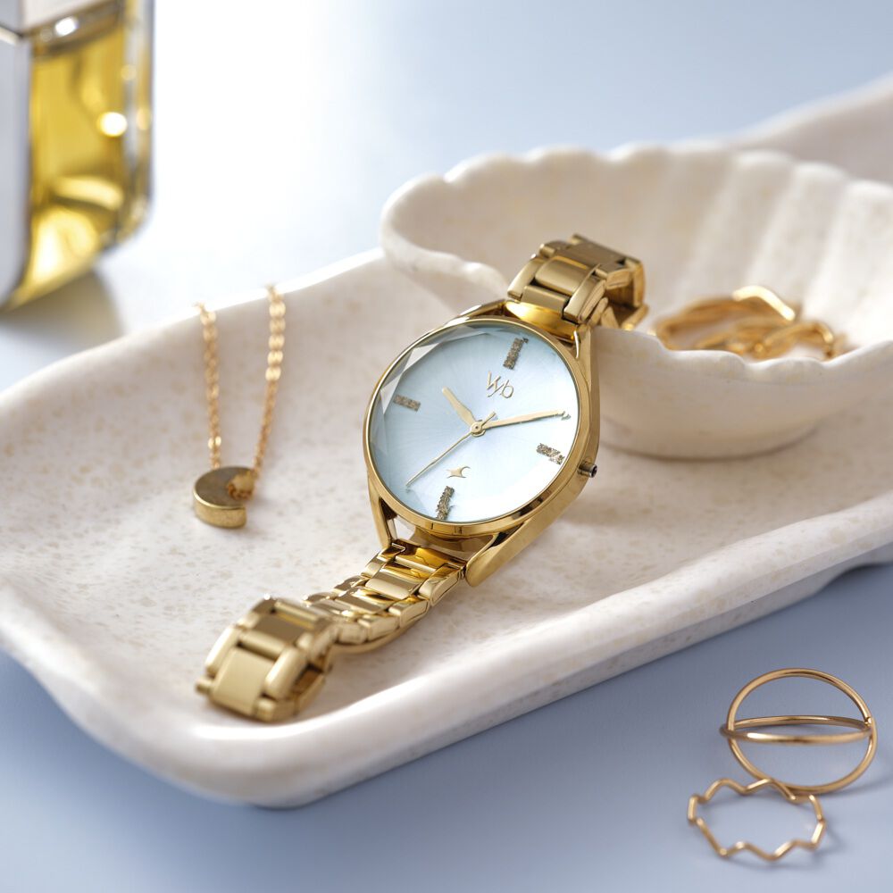 Fastrack Vyb Aurora Quartz Analog Green Dial Golden Color Metal Strap Watch For Girls FV60052YM01W