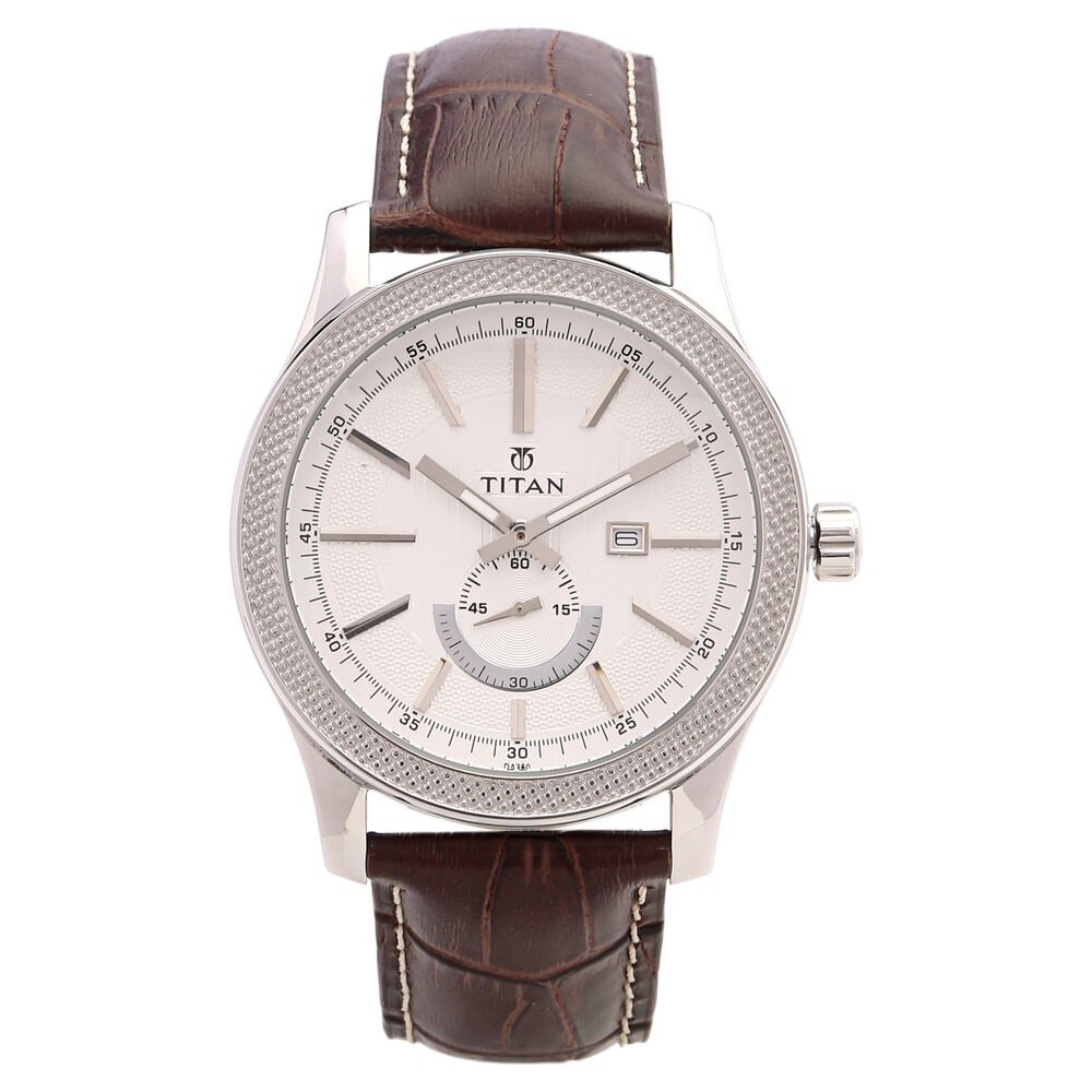 Titan Analog with Date Silver Dial, Leather Strap watch for Men-NE9386SL01
