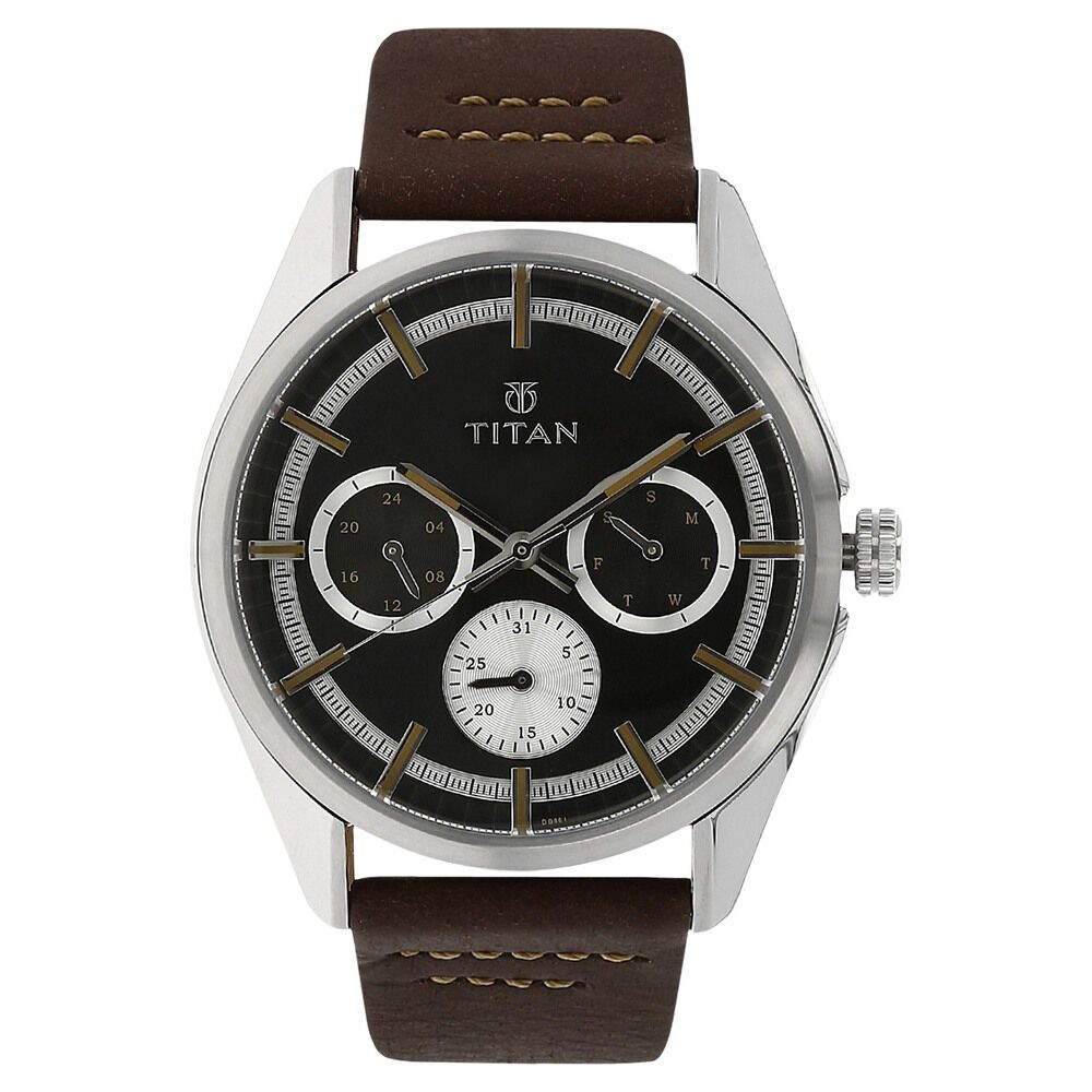 Titan Purple Past Modern Black Dial Quartz Multifunction Leather Strap watch for Men-90084SL01