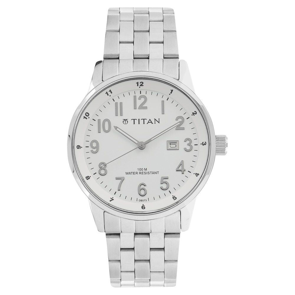 Titan Quartz Analog with Date White Dial Stainless Steel Strap Watch for Men-NK9441SM02