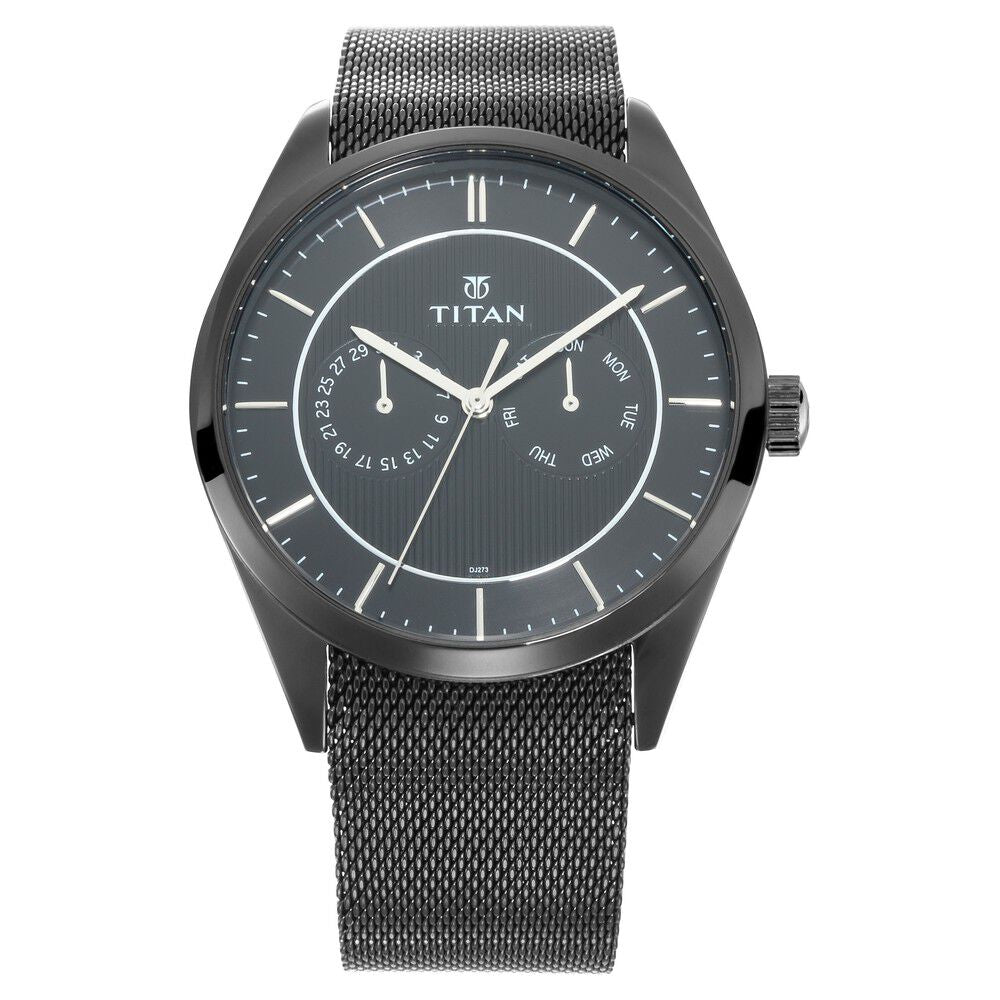 Titan Quartz Multifunction Black Dial Stainless Steel Strap Watch for Men-NN90098NM01