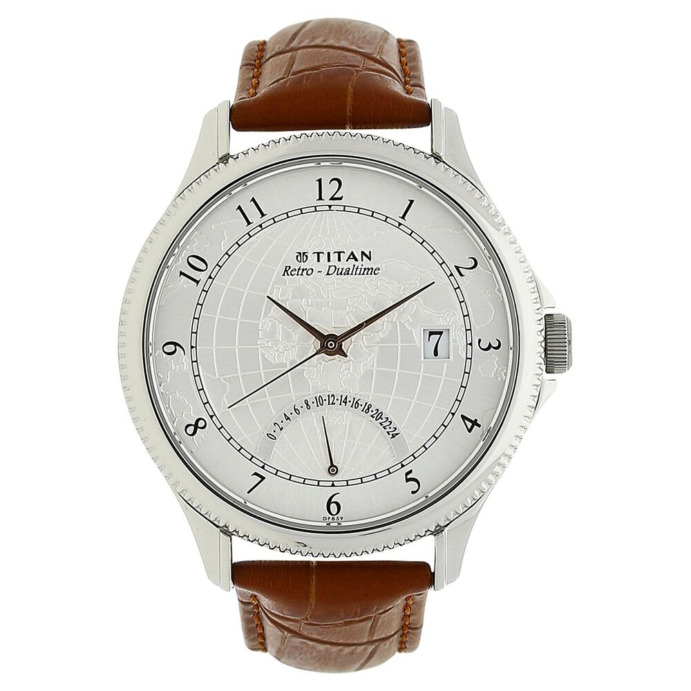 Titan Globe Trotter Silver Dual Time Leather Strap Watch for Men-NK1704SL01