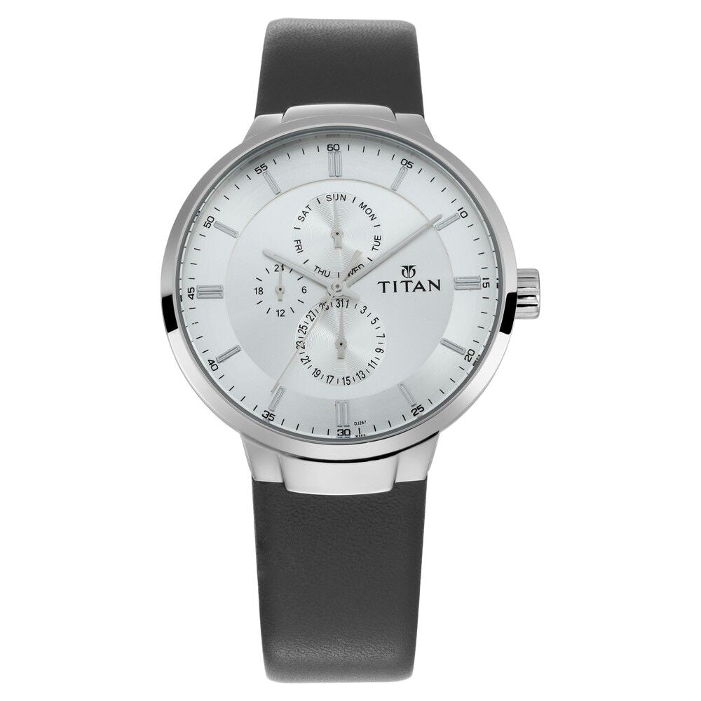 Titan Quartz Multifunction Silver Dial Leather Strap Watch for Men-NN1734SL01