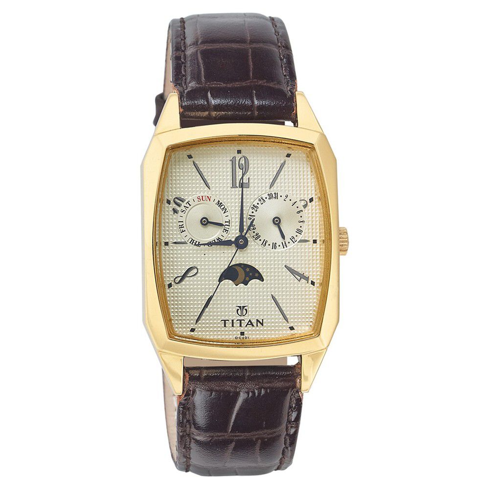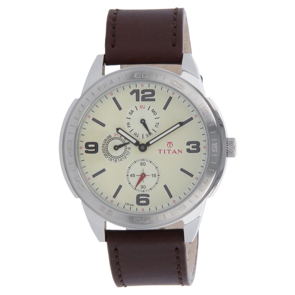 Titan Quartz Multifunction Champagne Dial Leather Strap Watch for Men-NK1585SL05