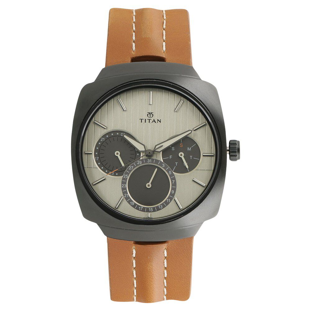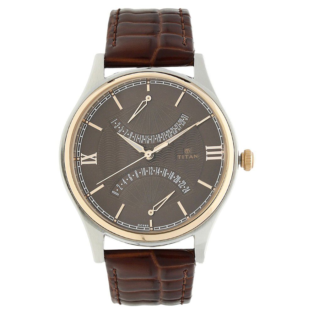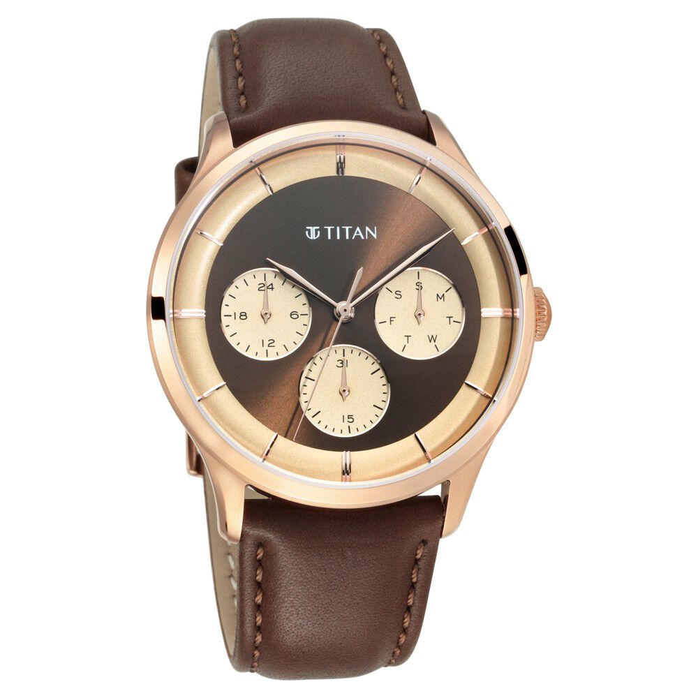 Titan Quartz Multifunction Brown Dial Leather Strap Watch for Men-NF1620KL01