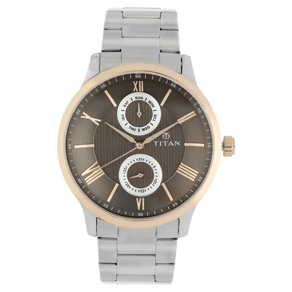 Titan Quartz Multifunction Brown Dial Stainless Steel Strap Watch for Men-NN90100KM01