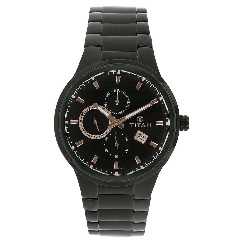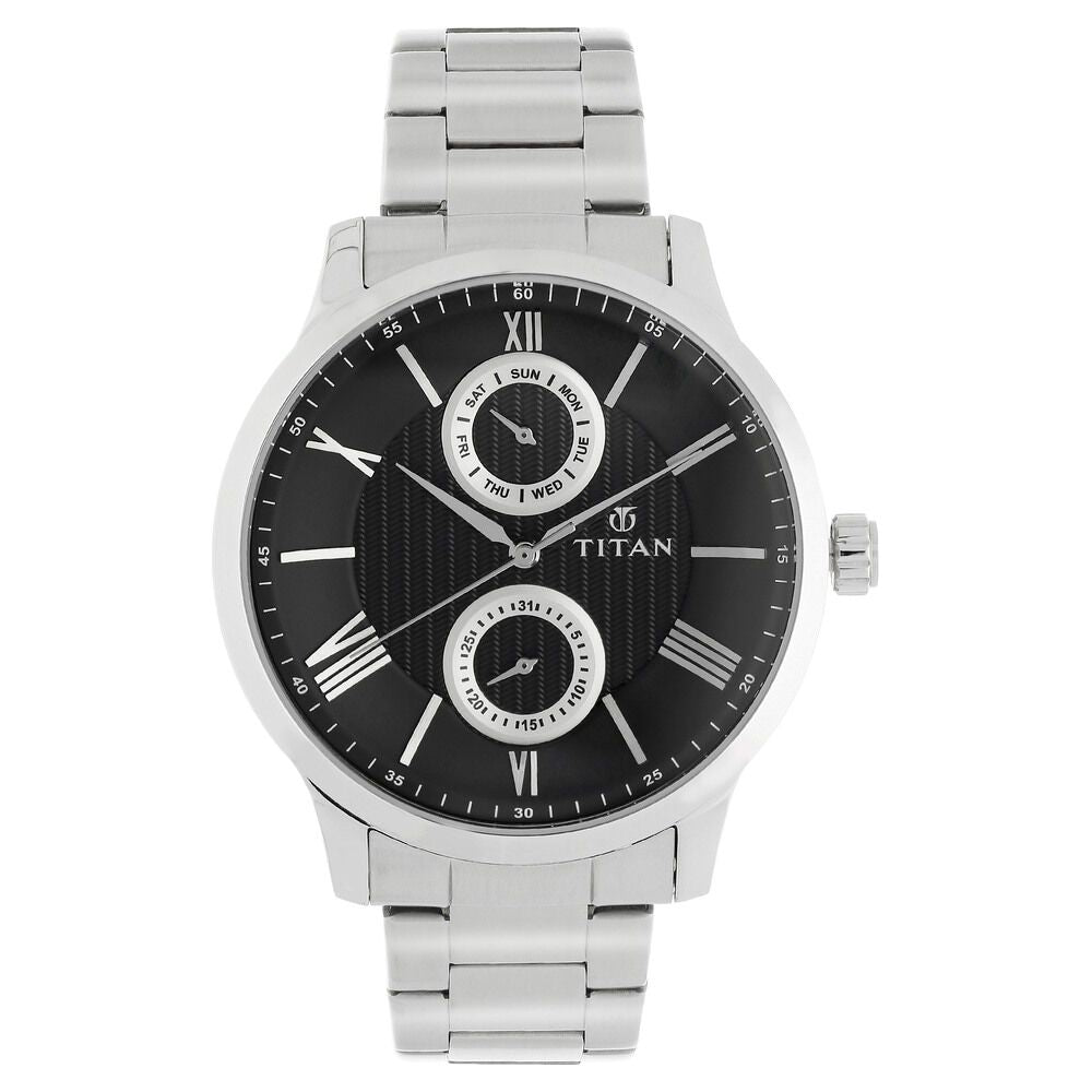 Titan Quartz Multifunction Black Dial Stainless Steel Strap Watch for Men-NM90041KM01