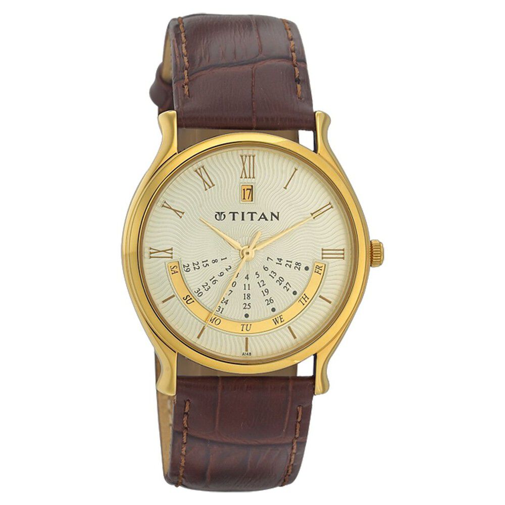 Titan Analog with Date Champagne Dial Quartz Leather Strap watch for Men-NK1639YL01