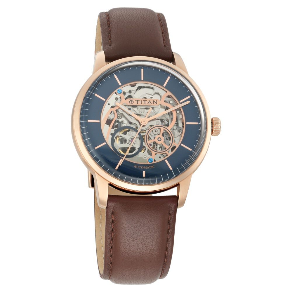 Titan Automatics Blue Dial Brown Leather Strap Watch for Men-90110WL01