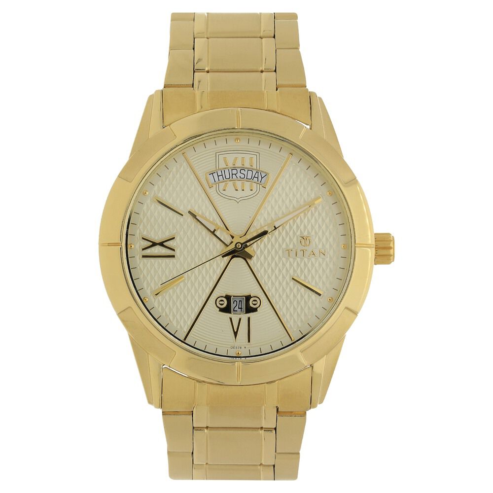 Titan Regalia Baron Champagne Dial Analog with Day and Date Stainless Steel Strap watch for Men-NN1743YM01