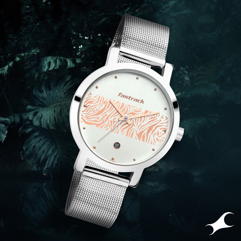 Fastrack Animal Print Quartz Analog with Date Bicolour Dial Stainless Steel Strap Watch for Girls NS6222SM03