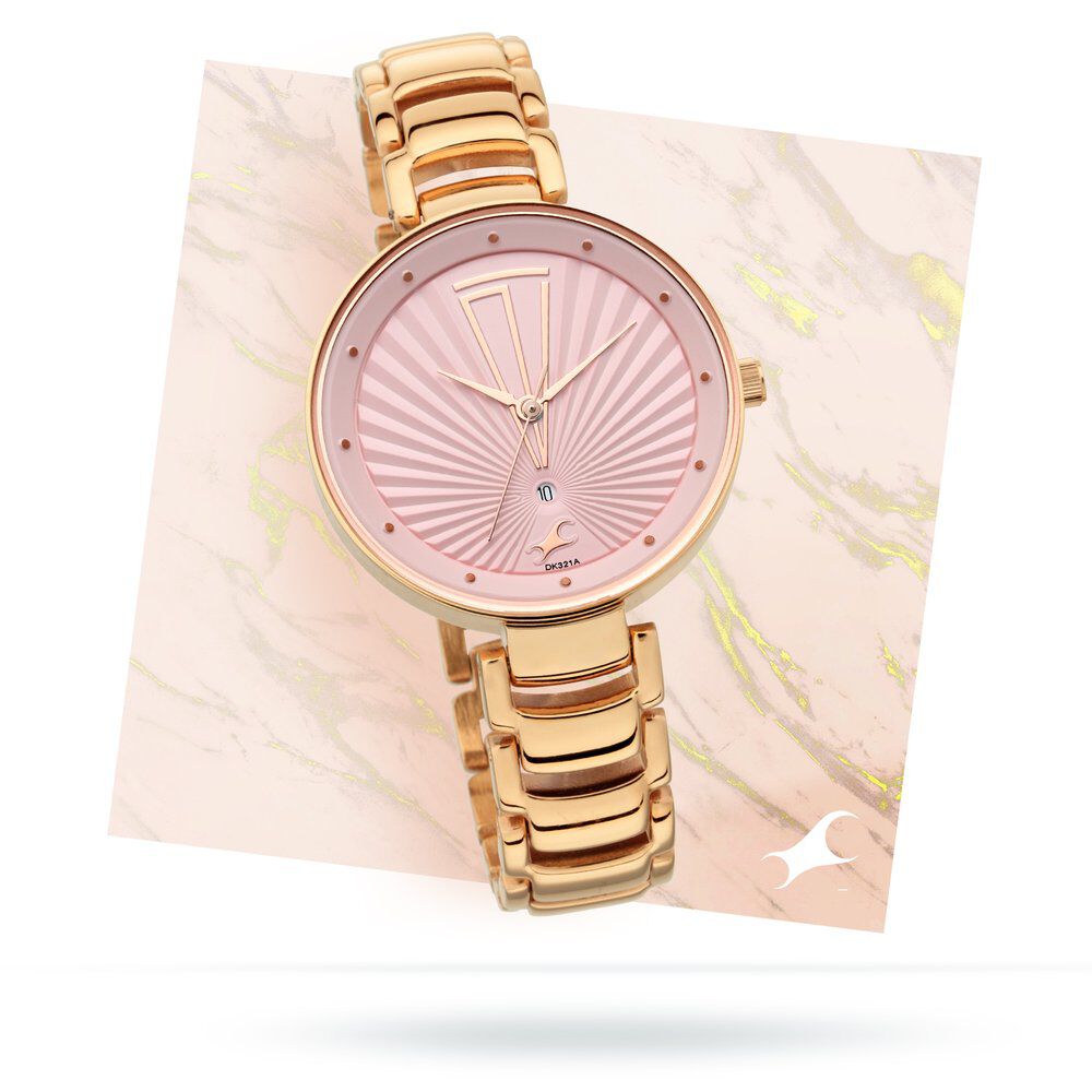 Fastrack Ruffles Quartz Analog with Date Pink Dial Stainless Steel Strap Watch for Girls NS6216WM01