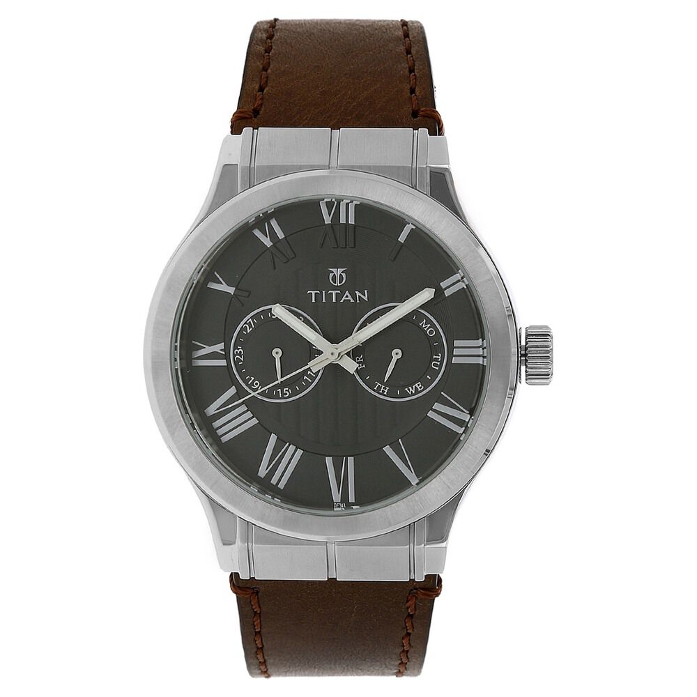 Titan Quartz Analog with Day and Date Black Dial Leather Strap Watch for Men-90051SL01J