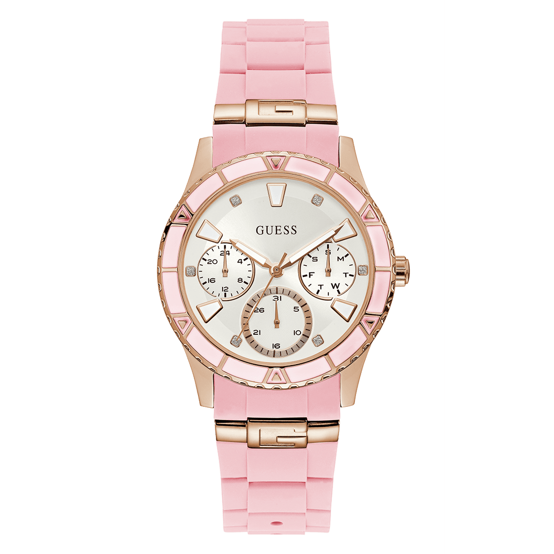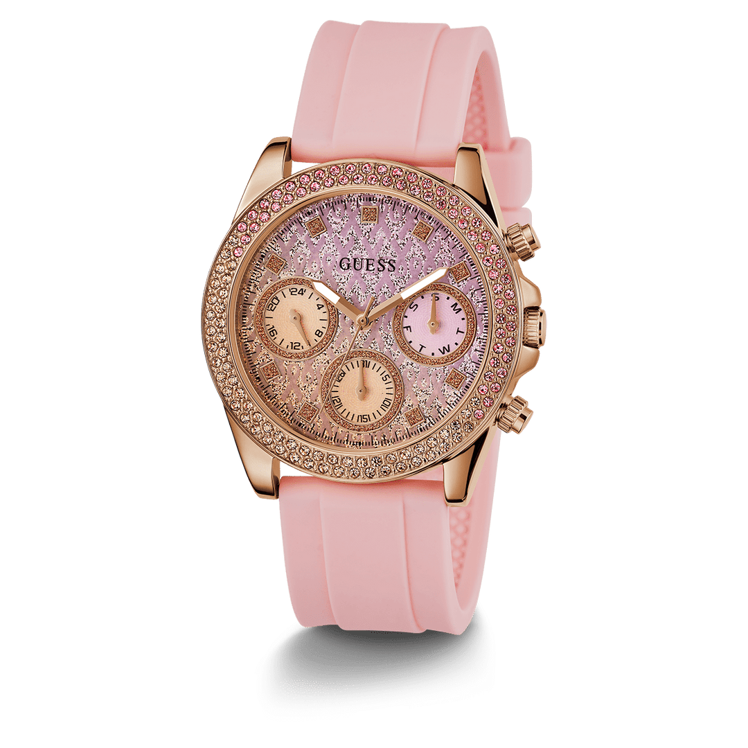 GUESS Ladies Pink Rose Gold Tone Multi-Function Watch