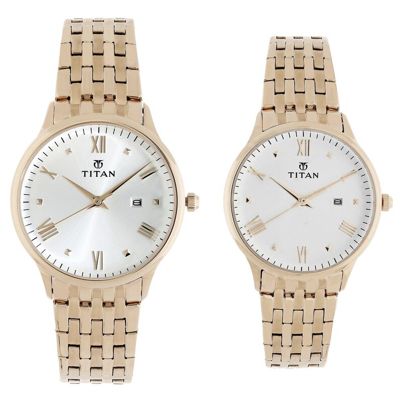 Titan Bandhan Rose Gold Dial Analog With Date Stainless Steel Strap Watch For Couple