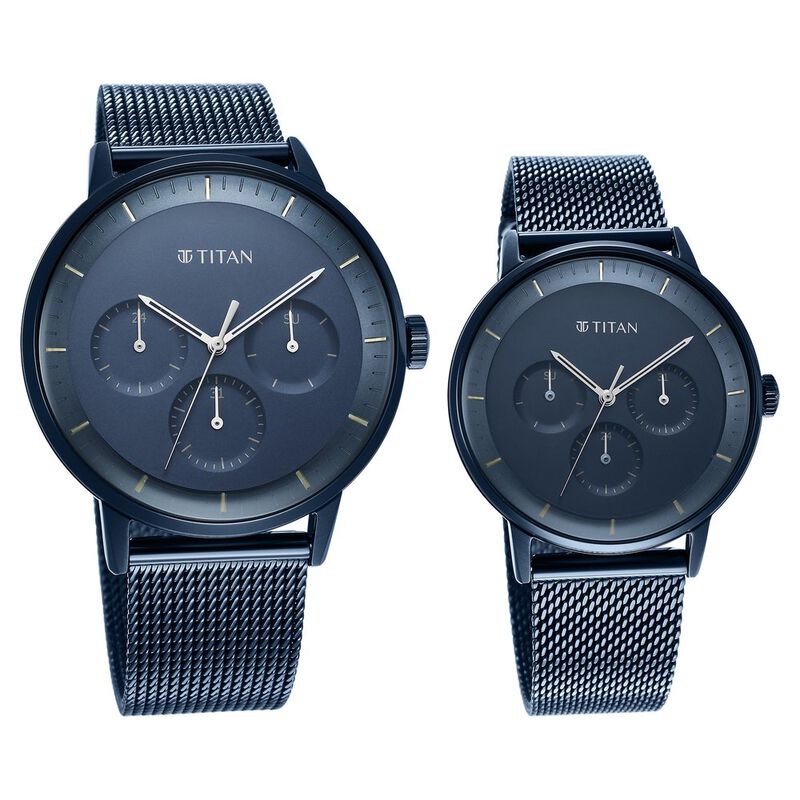 Titan Modern Bandhan Blue Dial Quartz Multifunction Stainless Steel Strap Watch For Couple