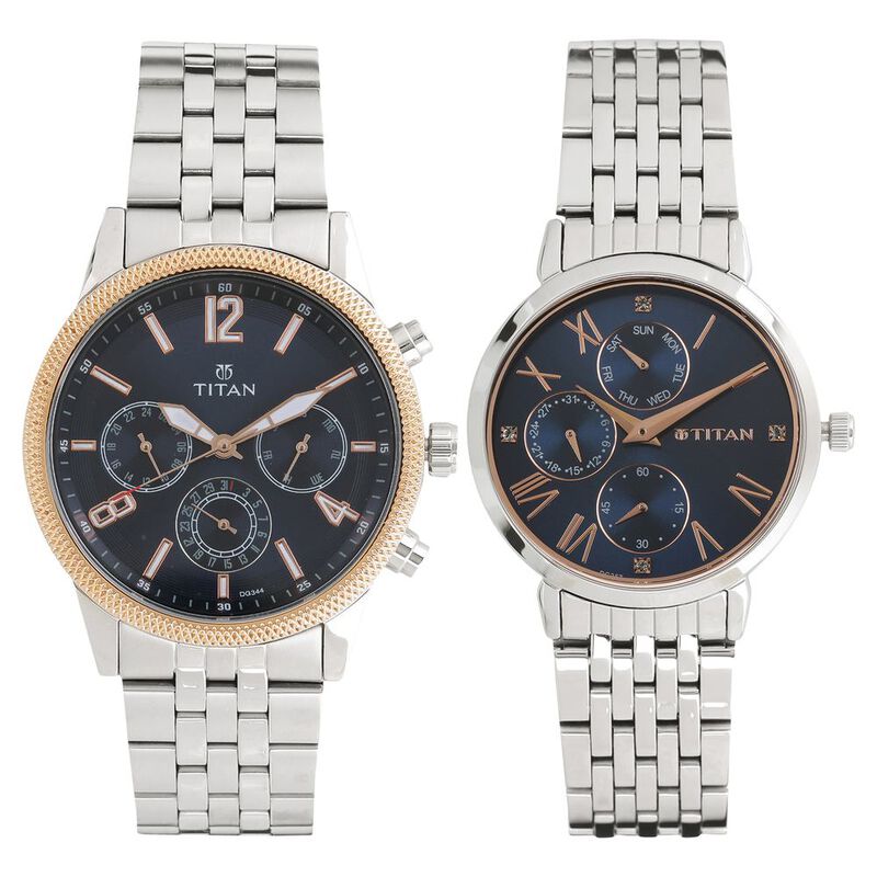 Titan Bandhan Blue Dial Quartz Multifunction Stainless Steel Strap Watch For Couple