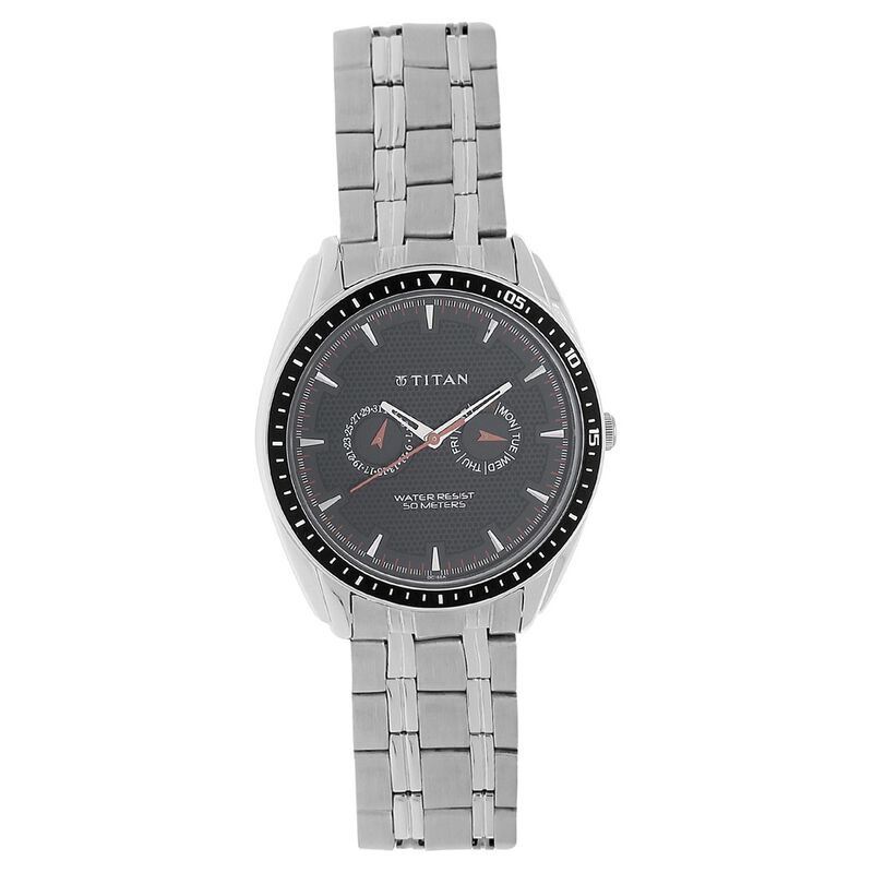 Titan Purple Black Dial Analog With Day And Date Stainless Steel Strap Watch For Men