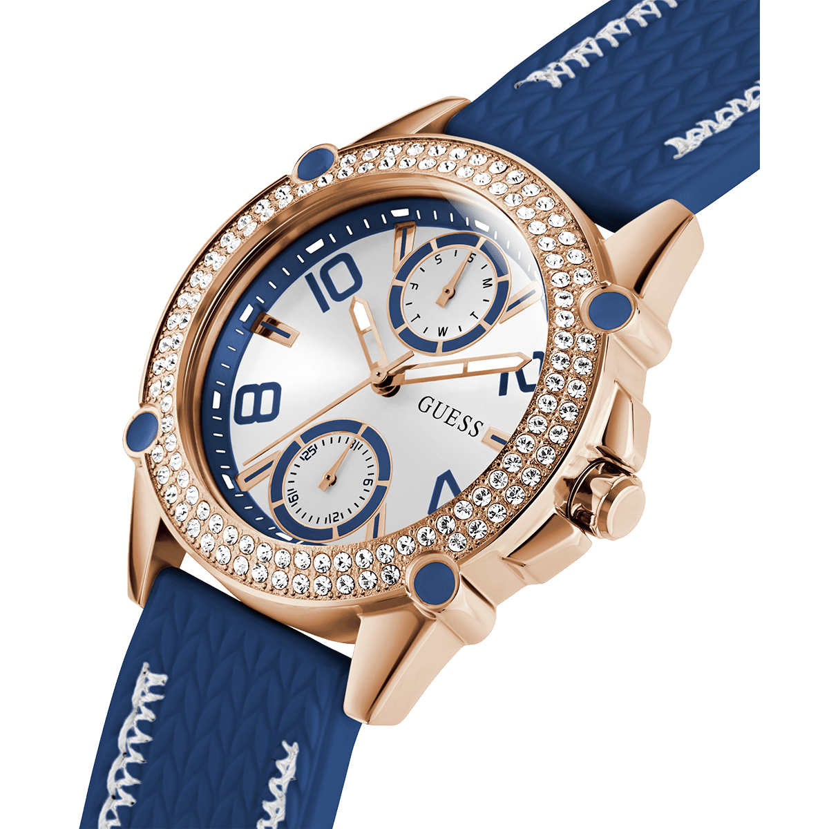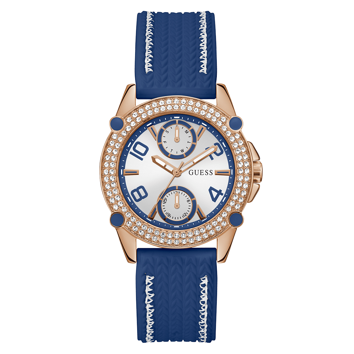 GUESS Ladies Blue Rose Gold Tone Multi-Function Watch
