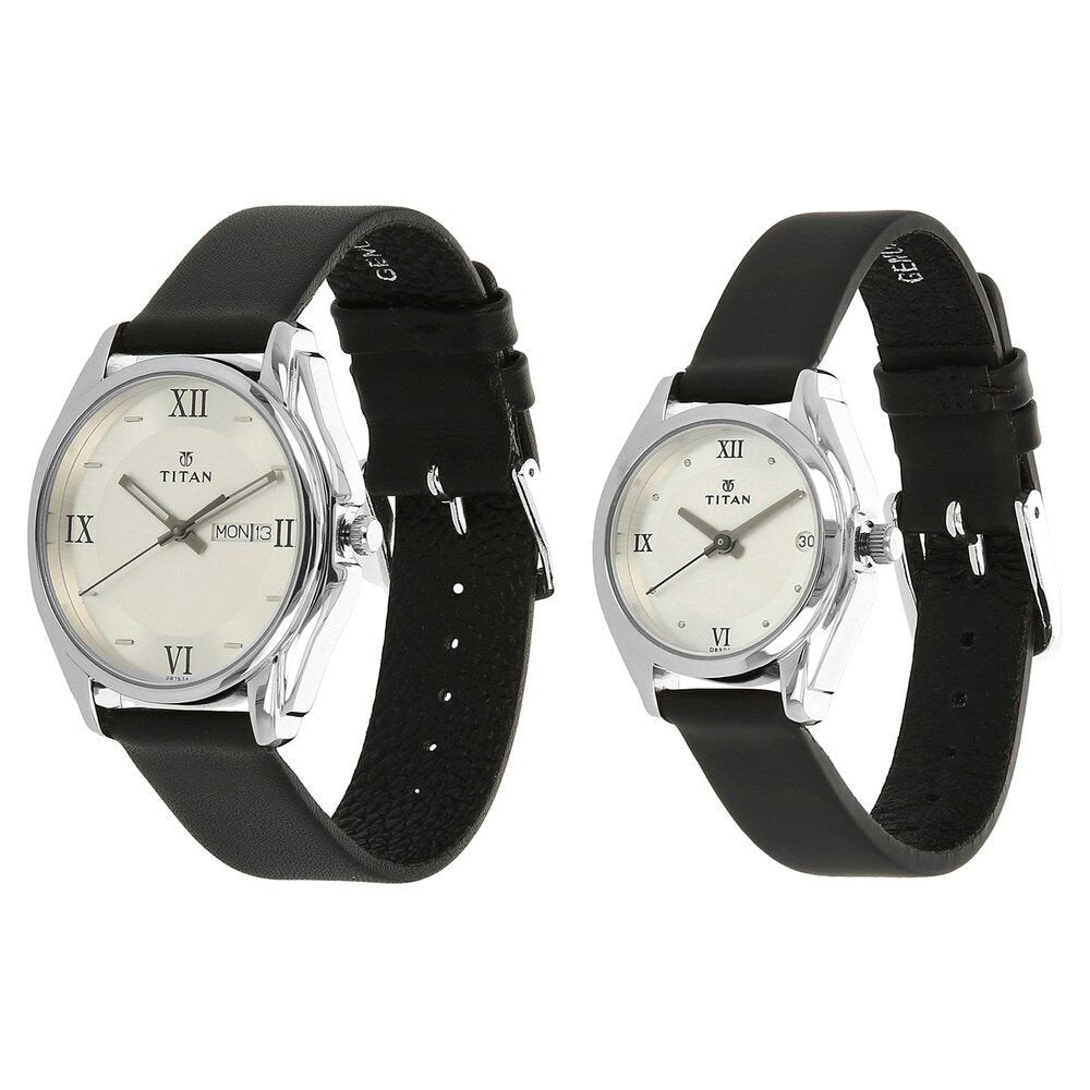 Titan Analog with Day and Date Silver Dial Leather Strap watch for Couple - The Watch Factory ®