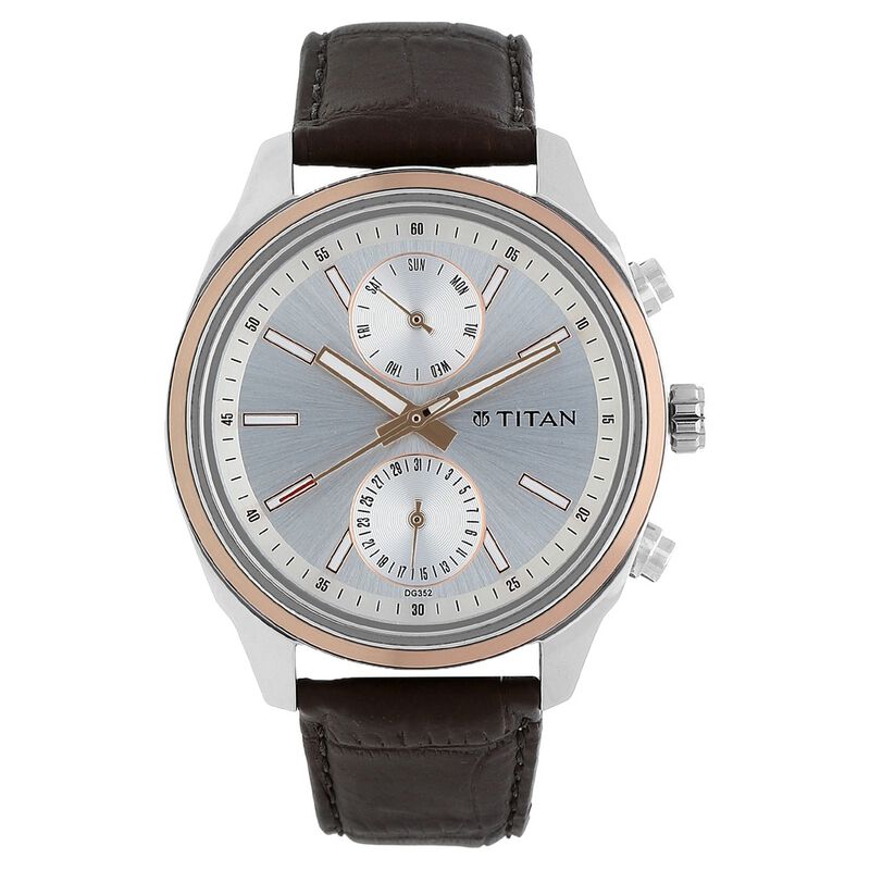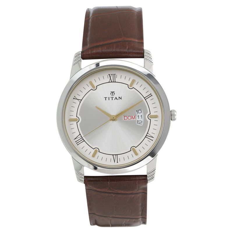 Titan Quartz Analog With Day And Date Silver Dial Leather Strap Watch For Men