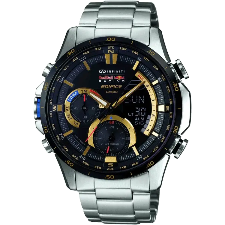 - Energy: Alarm (S) Auto Calendar Chronograph/Stopwatch Compass Countdown Timer Light Function Moon Data / Tide Graph Shock Resistant Thermometer Vibration Resistant World Time