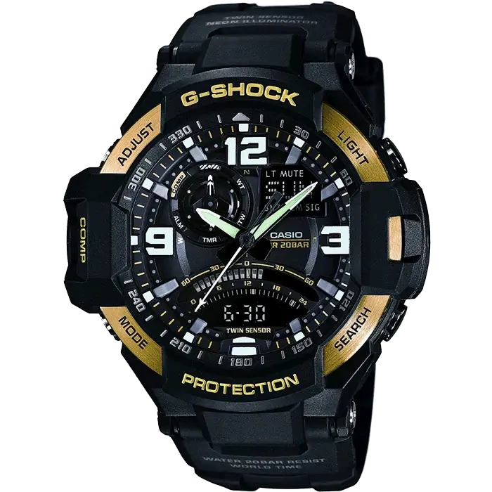 - Energy: Alarm (S) Auto Calendar Chronograph/Stopwatch Compass Countdown Timer Light Function Moon Data / Tide Graph Shock Resistant Thermometer Vibration Resistant World Time