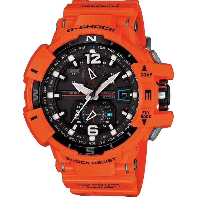 - Energy: Alarm (S) Auto Calendar Chronograph/Stopwatch Compass Countdown Timer Light Function Moon Data / Tide Graph Shock Resistant Solar Powered World Time