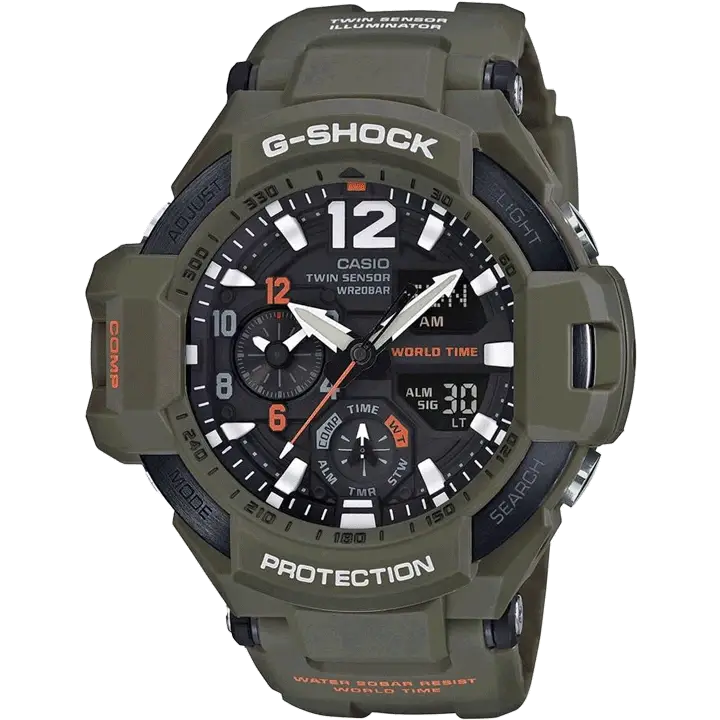 - Energy: Alarm (S) Auto Calendar Chronograph/Stopwatch Compass Countdown Timer Light Function Moon Data / Tide Graph Shock Resistant Thermometer Vibration Resistant World Time